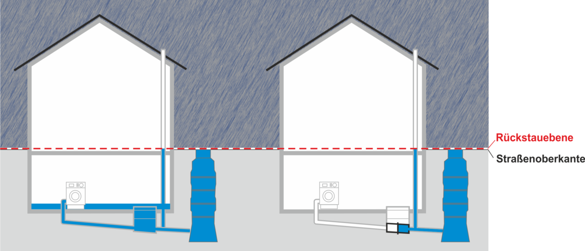 Das Abwasser staut sich dann auf und überflutet tiefliegende Räume und Ablaufstellen wie Bodenabläufe, Duschen, WCs und Waschbecken, die unterhalb der Rückstauebene liegen.